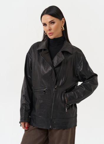 Женская косуха из натуральной кожи в черном цвете - универсальная модель, которая не сдает позиций с 1970-го года! В этом сезоне в трендовом оверсайз- фасоне. Он подойдет всем типам фигуры и будет хорошо смотреться с любым образом, а если вы хотите выделиться, то наденьте ее с легким платьем. Косуха дополнена отложным воротником и молнией. Если вы ищете куртку, которая будет вне времени и будет сочетается с любой одеждой, то это то, что вы искали.