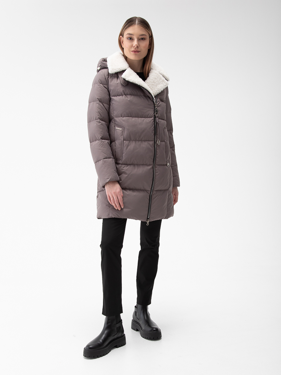Крой воротника - съёмный капюшон, отделка эко мех