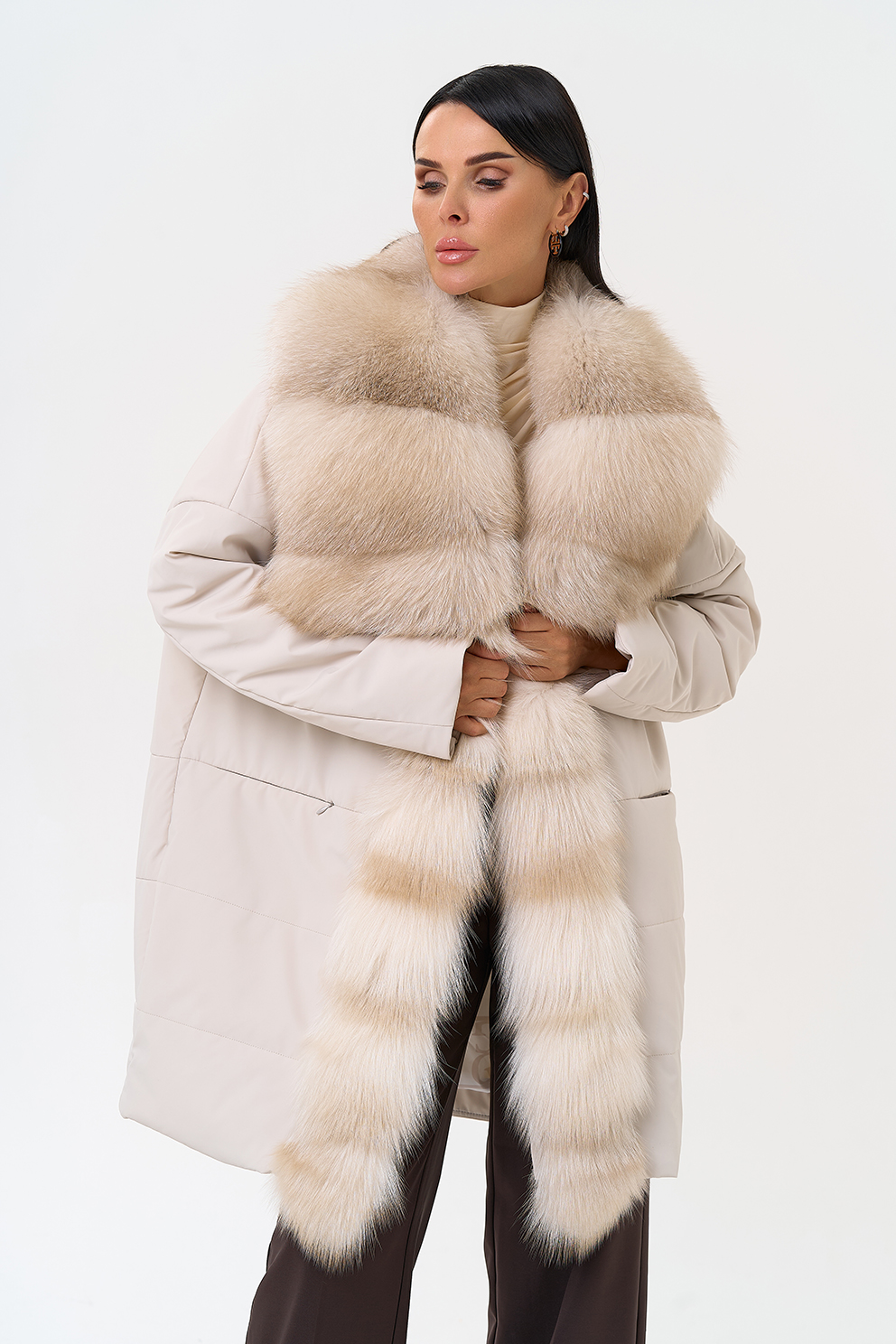 Вид застежки - кнопки, брендированный пояс из натуральной кожи